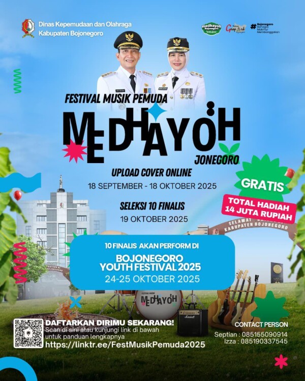 Bagi warga Bojonegoro yang suka musik, event ini perlu untuk diikuti. Yakni Festival Musik Pemuda Medhayoh Jonegoro. Kompetisi ini digelar Dinas Kepemudaan dan Olahraga (Dinpora) dalam rangka memperingati Hari Jadi Kabupaten Bojonegoro dan Hari Sumpah Pemuda 2025.