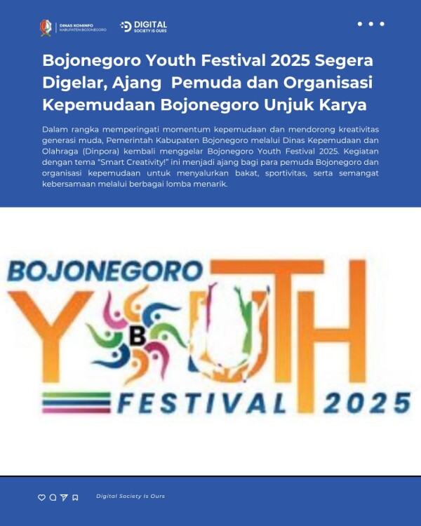Dalam rangka memperingati momentum kepemudaan dan mendorong kreativitas generasi muda, Pemerintah Kabupaten Bojonegoro melalui Dinas Kepemudaan dan Olahraga (Dinpora) kembali menggelar Bojonegoro Youth Festival 2025. Kegiatan dengan tema “Smart Creativity!” ini menjadi ajang bagi para pemuda Bojonegoro dan organisasi kepemudaan untuk menyalurkan bakat, sportivitas, serta semangat kebersamaan melalui berbagai lomba menarik.