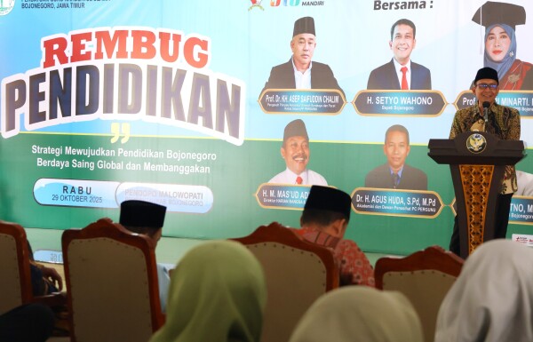 Pemerintah Kabupaten Bojonegoro bersama Persatuan Guru Nahdlatul Ulama (PERGUNU) Bojonegoro menggelar Rembug Pendidikan bertajuk “Strategi Mewujudkan Pendidikan Bojonegoro Berdaya Saing Global dan Membanggakan”, Rabu (29/10/2025) di Pendopo Malowopati. Kegiatan ini menjadi wadah strategis untuk merumuskan arah, rekomendasi, serta strategi dalam memajukan dunia pendidikan agar mampu menjawab tantangan global.