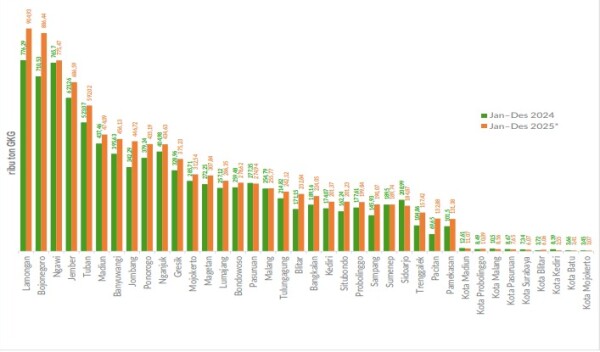 Peningkatan tajam ini menegaskan posisi Bojonegoro sebagai salah satu daerah penopang utama ketahanan pangan di Jawa Timur. Dengan capaian tersebut, Bojonegoro kini menempati peringkat kedua produksi padi terbesar di Jawa Timur, hanya terpaut tipis dari Kabupaten Lamongan yang menghasilkan 904 ribu ton GKG pada tahun yang sama.