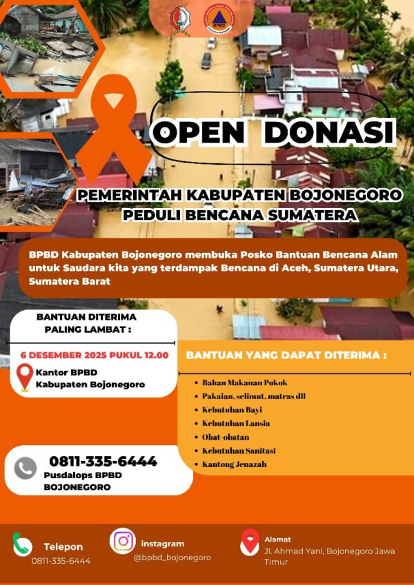 Guna membantu korban terdampak bencana alam yang terjadi di Sumatera Utara dan Sumatera Barat, Pemerintah Kabupaten Bojonegoro melalui Badan Penanggulangan Bencana Daerah (BPBD) membuka posko donasi peduli bencana.