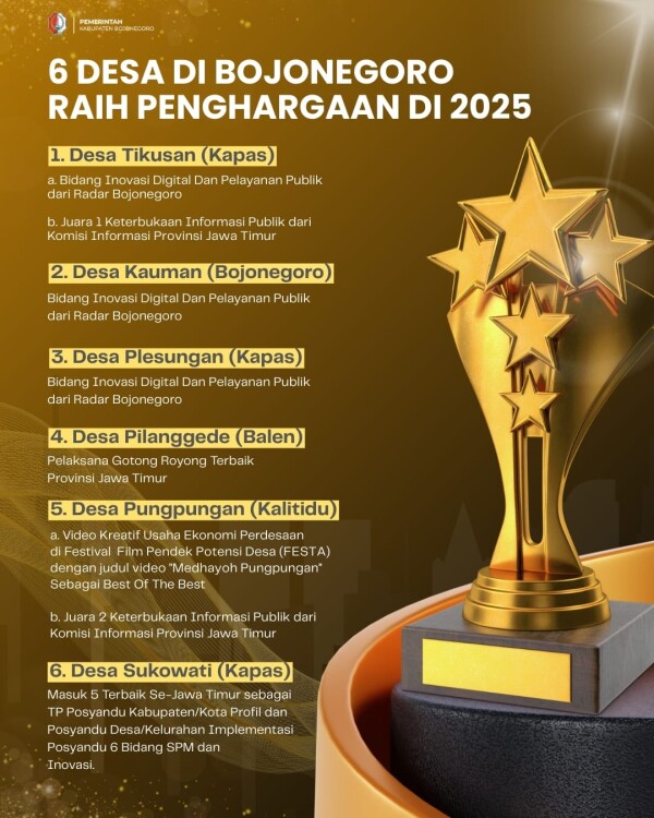 Pembangunan desa di Kabupaten Bojonegoro membuahkan hasil menggembirakan. Sepanjang tahun 2025, enam desa telah menorehkan prestasi membanggakan. Prestasi ini menunjukkan komitmen Pemkab Bojonegoro dalam meningkatkan kualitas tata kelola pemerintahan desa, inovasi digital, hingga pemberdayaan ekonomi masyarakat.