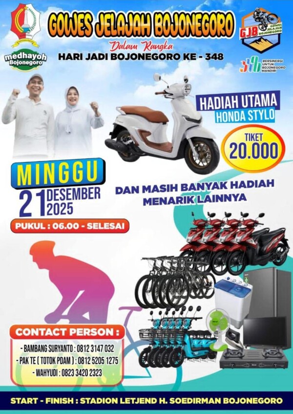 Dinas Kepemudaan dan Olahraga (Dinpora) Kabupaten Bojonegoro bekerjasama dengan Komunitas MTB Bojonegoro akan menggelar Gowes Jelajah Bojonegoro (GJB) 2025. Rencananya, kegiatan ini akan dilaksanakan Minggu (21/12/2025) dengan titik start dan finish di Stadion Letjend H. Soedirman.
