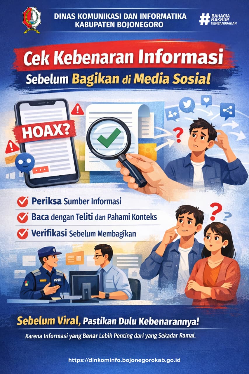 Dinkominfo Kabupaten Bojonegoro juga mengajak seluruh masyarakat untuk turut berperan aktif menjaga ruang digital yang sehat dan bertanggung jawab. Langkah sederhana seperti memeriksa sumber informasi, membaca konten secara menyeluruh, serta memahami konteks sebelum membagikan informasi merupakan bentuk kontribusi nyata dalam mencegah penyebaran hoaks.