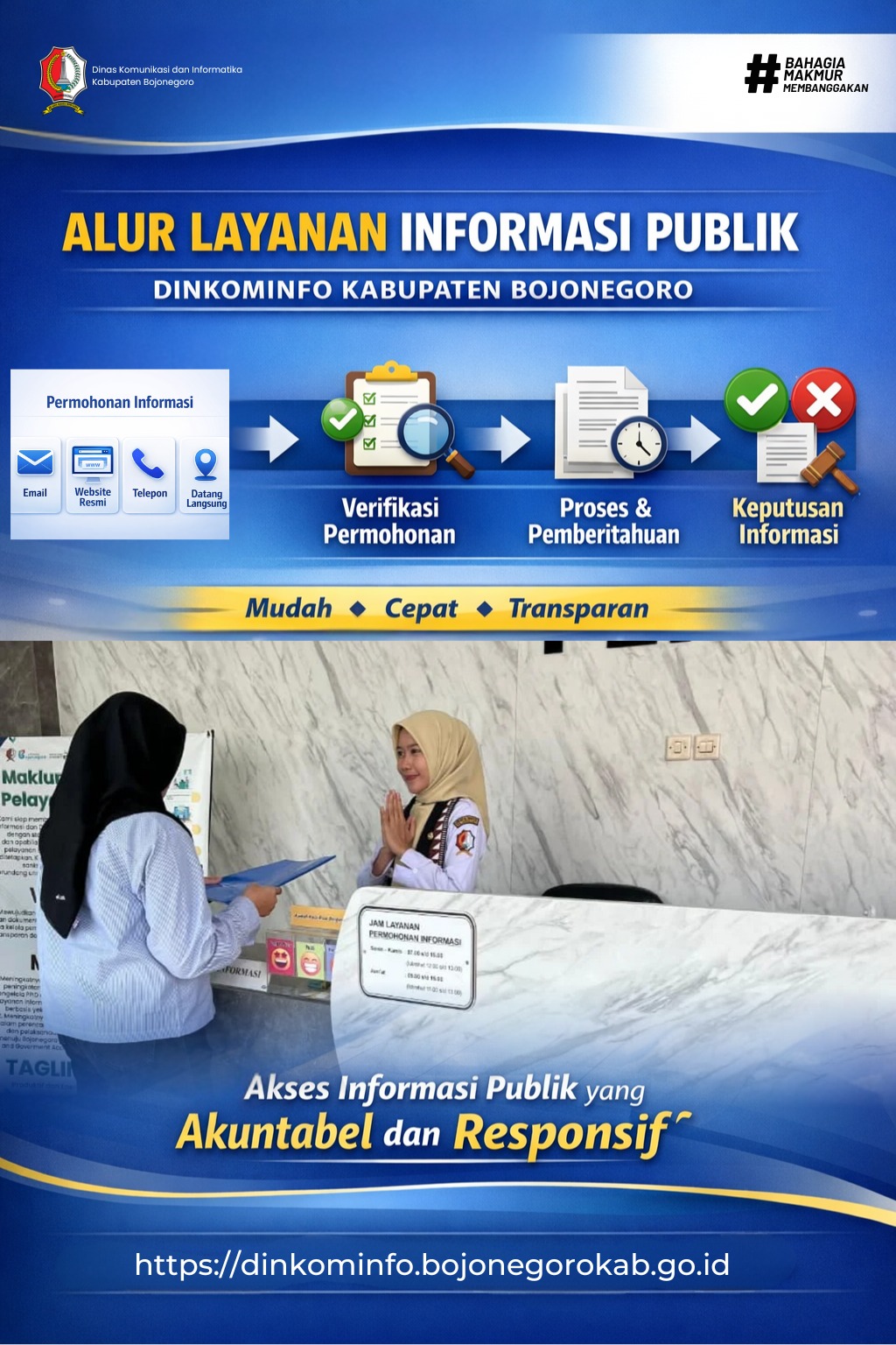 Dinas Komunikasi dan Informatika Kabupaten Bojonegoro terus memperkuat komitmen keterbukaan informasi publik melalui penerapan alur layanan Pejabat Pengelola Informasi dan Dokumentasi (PPID) yang jelas, terstruktur, dan mudah dipahami masyarakat.