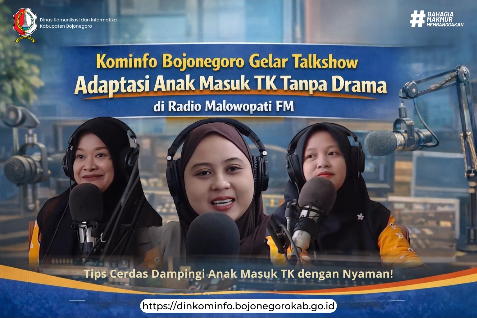 Dinas Komunikasi dan Informatika (Kominfo) Kabupaten Bojonegoro melalui Radio Malowopati FM 95,8 MHz menggelar talkshow edukatif bertema “Adaptasi Anak Masuk TK Tanpa Drama” sebagai upaya memberikan pemahaman kepada masyarakat, khususnya orang tua, dalam mendampingi anak memasuki dunia sekolah. Talkshow tersebut disiarkan langsung dari Studio Radio Malowopati FM, Jalan AKBP M. Soeroko, Jumat (15/2/2026).