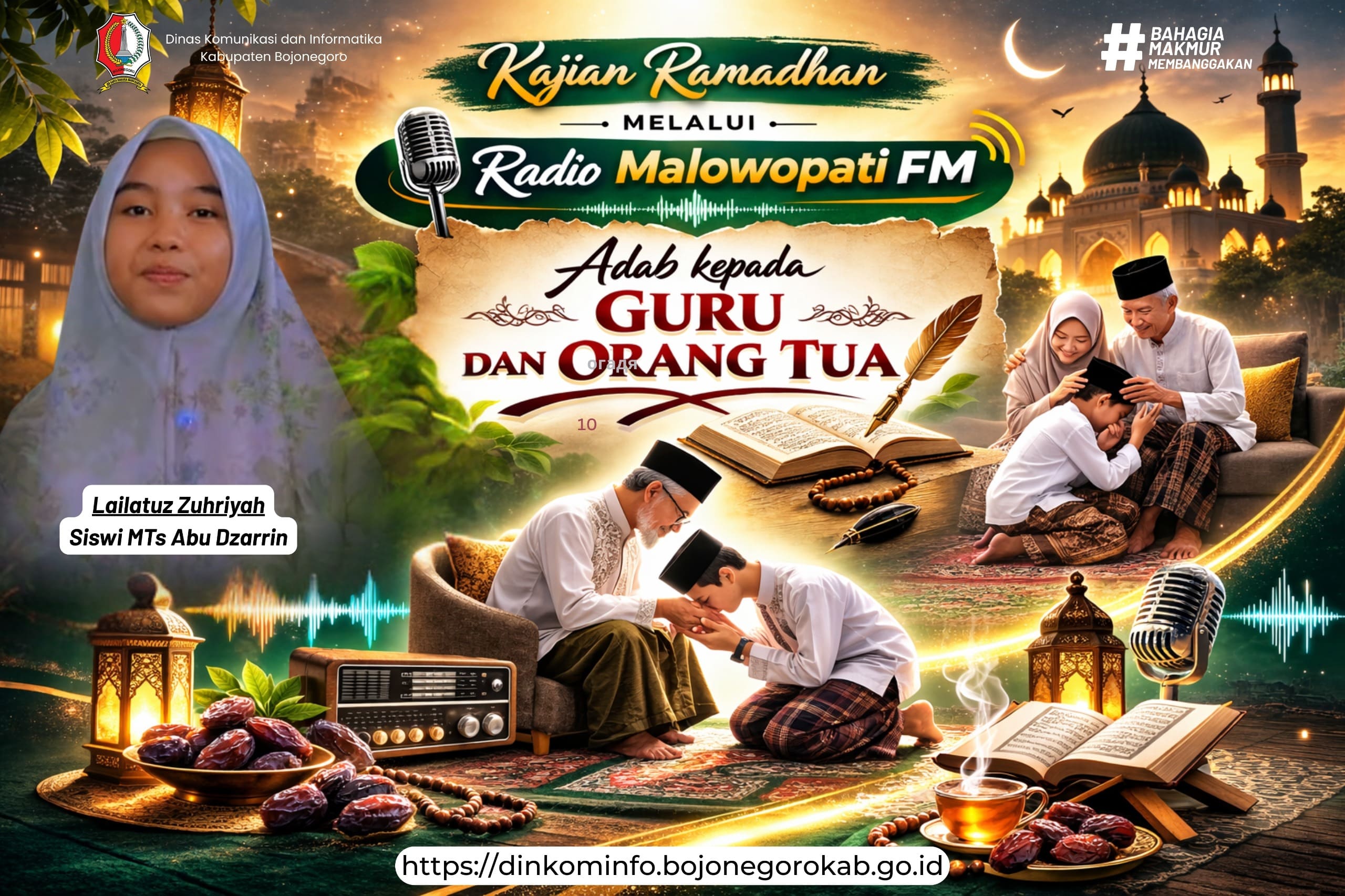 Dinas Komunikasi dan Informatika Kabupaten Bojonegoro melalui Radio Malowopati FM terus menghadirkan program siaran edukatif dan religius selama bulan suci Ramadhan. Salah satu program kajian keislaman bertema “Adab kepada Guru dan Orang Tua” menjadi bagian dari upaya penguatan nilai spiritual dan karakter masyarakat.