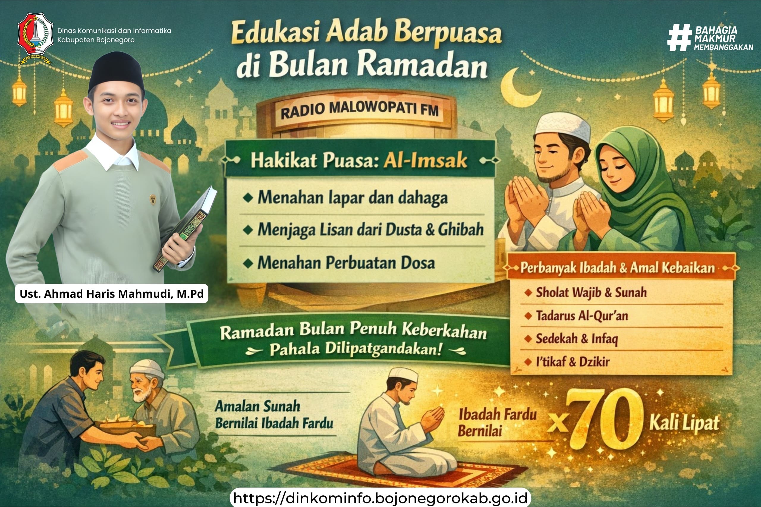 Dinas Komunikasi dan Informatika (Dinkominfo) Kabupaten Bojonegoro melalui Radio Malowopati FM menghadirkan siaran edukatif keagamaan selama bulan Ramadan. Salah satunya dengan mengangkat materi tentang adab dalam menjalankan ibadah puasa (Adabus Siam) yang disiarkan langsung dari Studio Radio Malowopati FM, Rabu (4/3/2026).