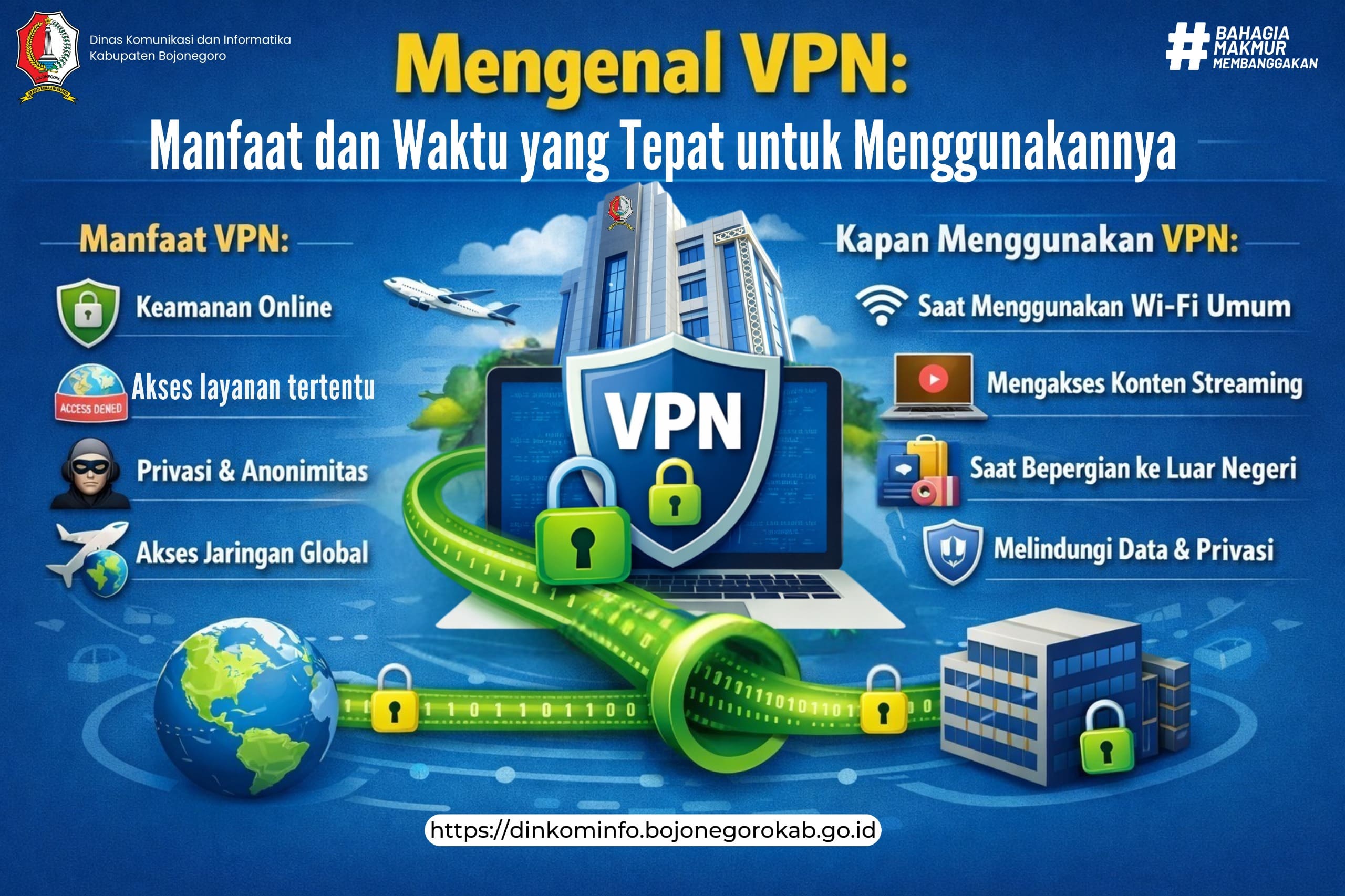 Dinas Komunikasi dan Informatika (Dinkominfo) Kabupaten Bojonegoro mengimbau masyarakat untuk lebih bijak dalam menggunakan internet serta memahami pentingnya keamanan digital. Penggunaan VPN dapat menjadi salah satu langkah preventif, namun tetap harus dibarengi dengan perilaku digital yang aman, seperti tidak membagikan data pribadi secara sembarangan. [dh/nn/ans]