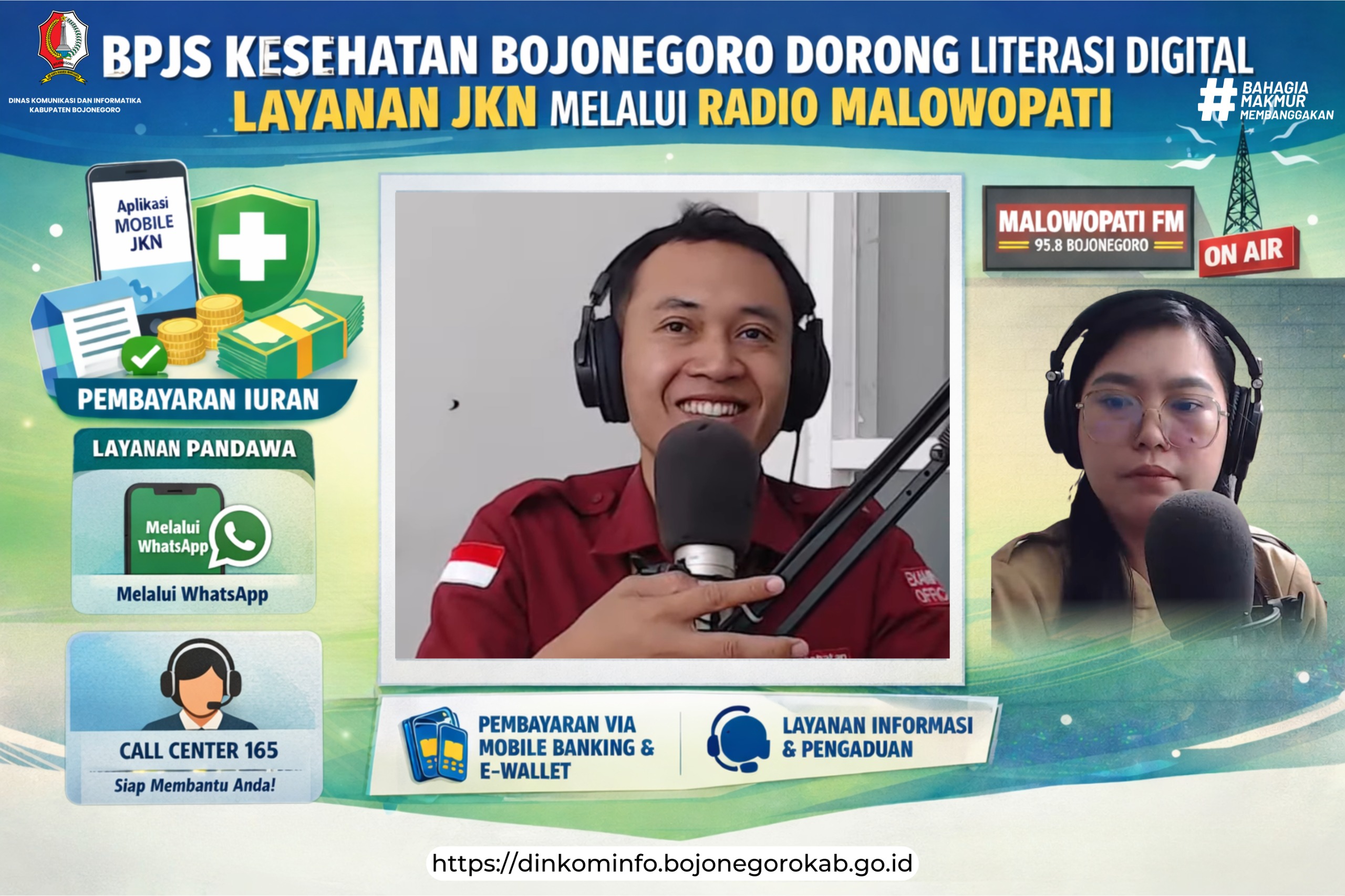 Dinas Komunikasi dan Informatika (Dinkominfo) Kabupaten Bojonegoro terus memperkuat perannya dalam menyebarluaskan informasi publik yang edukatif. Melalui siaran dialog interaktif di Radio Malowopati FM, Selasa (07/04/2026), masyarakat diajak memahami kemudahan layanan digital BPJS Kesehatan, khususnya dalam pengecekan tagihan dan pembayaran iuran Jaminan Kesehatan Nasional (JKN).