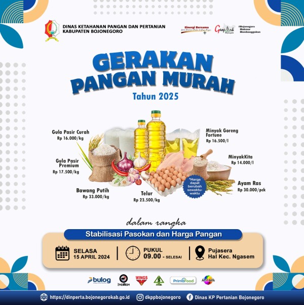 Pemkab Bojonegoro melalui Dinas Ketahanan Pangan dan Pertanian (DKPP) akan menggelar Gerakan Pangan Murah di Kecamatan Ngasem, Selasa (15/04/2025). Gerakan Pangan Murah...