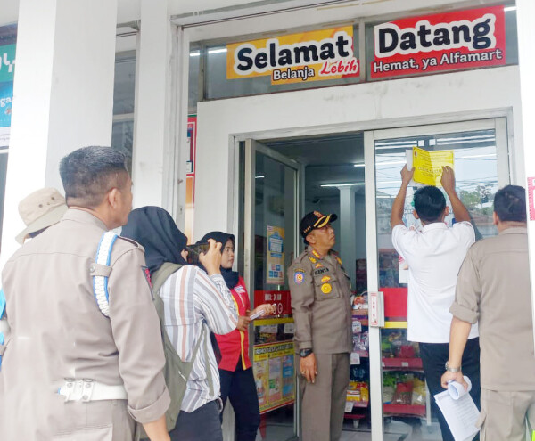 Pemkab Bojonegoro melalui tim gabungan, yakni Satpol PP bersama Dinas Penanaman Modal dan Pelayanan Terpadu Satu Pintu memasang stiker tanda bangunan sudah...