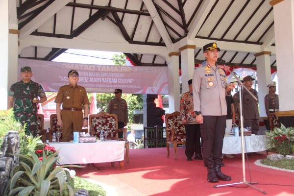 Pj Bupati Bojonegoro mengikuti apel Gelar Pasukan Operasi Mantap Praja Semeru 2024 di alun-alun Bojonegoro, Senin (19/8/2024). Apel yang digelar Polres Bojonegoro...