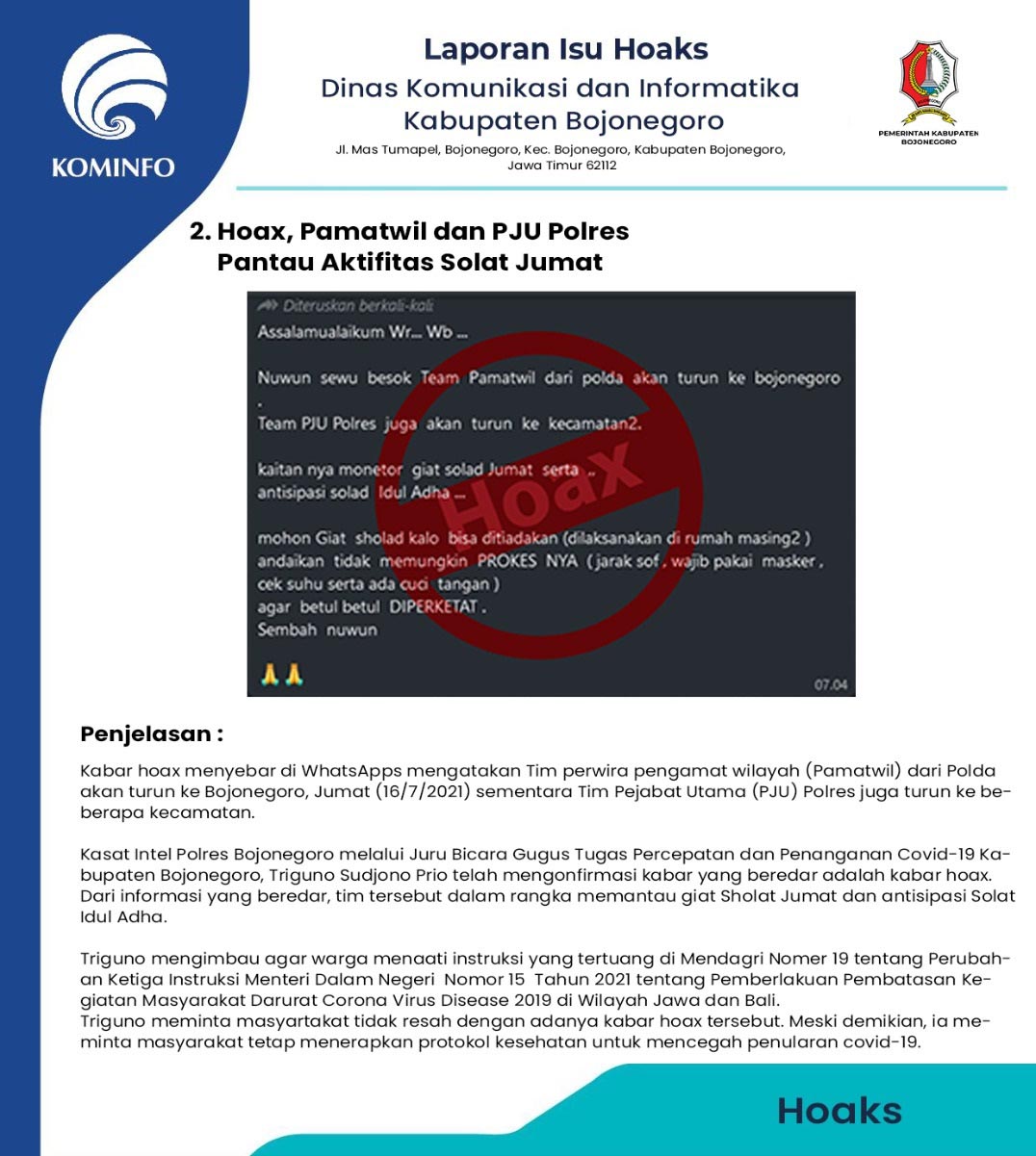Kabar hoax menyebar di WhatsApps mengatakan Tim perwira pengamat wilayah (Pamatwil) dari Polda akan turun ke Bojonegoro, Jumat (16/7/2021) sementara Tim Pejabat...